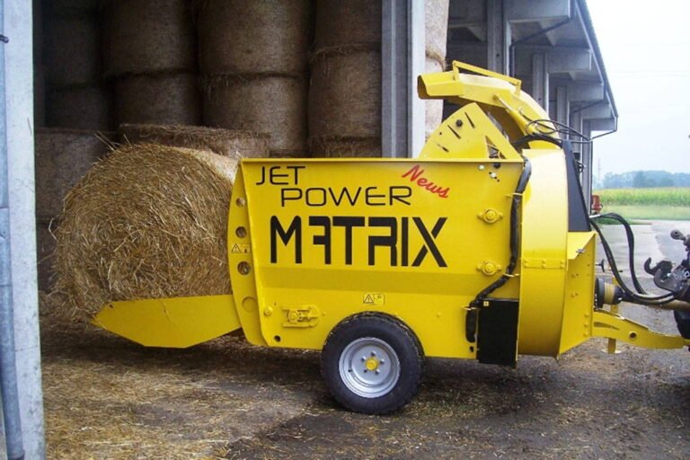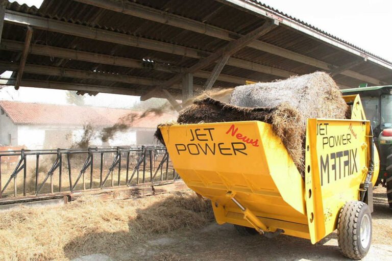 La Jet Power est une machine pour hacher et distribuer des produits secs et humides pour litière, logette ou mangeoire. La machine est idéale pour le traitement de produits fibreux secs et humides (paille, tiges de maïs, foin, herbe, etc.) conditionnés en balles rondes et prismatiques à distribuer sur litière, dans une logette ou dans une mangeoire.