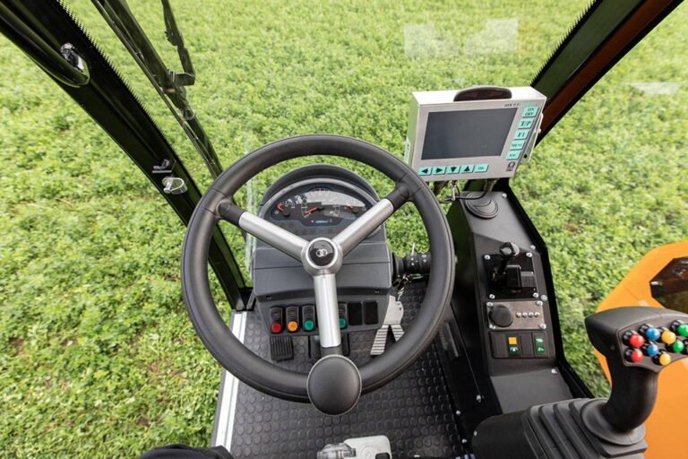 - Cabine avant à gauche, nouveau design, plus large et plus confortable, préparé pour la climatisation, avec chauffage et ventilation montés sous le siège du conducteur pour faciliter l’entretien et la gestion, panneau multifonction au design innovant pour contrôler la machine via un écran numérique , nouveau anti -supports anti-vibrations positionnés pour une meilleure stabilité, siège à ressorts, commandes ergonomiques avec joystick intégré dans l’accoudoir du siège conducteur, commandes au pied, affichage du poids, vitre supérieure de porte ouvrable séparément, essuie-glace avant plus long pour nettoyer une plus grande surface